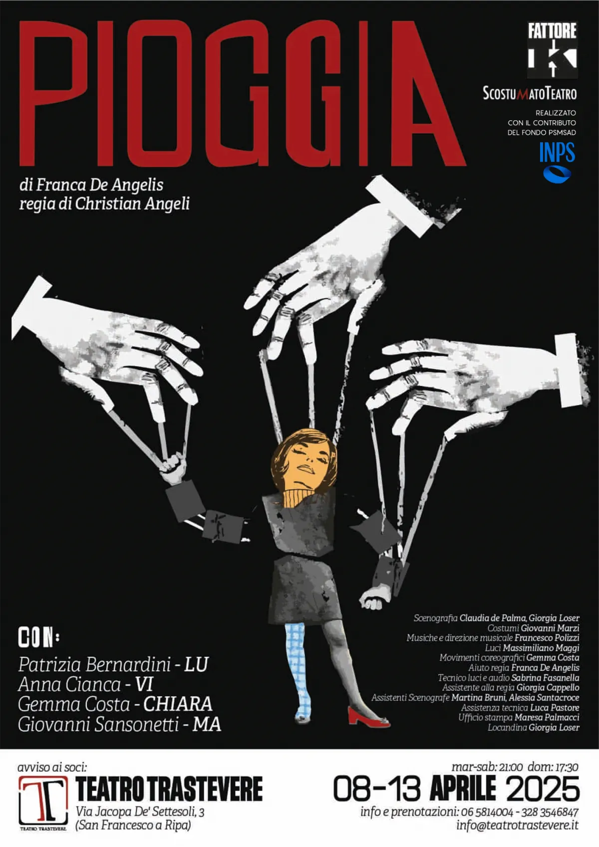 Progetto prodotto da Associazione Fattore K e messo in scena dalla compagnia Scostumato Teatro. Lo spettacolo ha debuttato presso il Teatro Trastevere dal 8 al 13 aprile 2025.